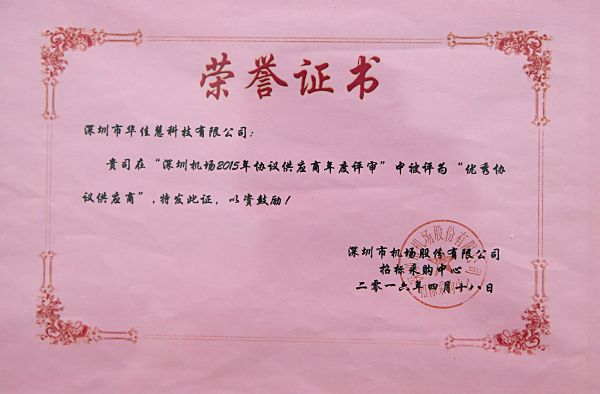 2015年深圳机场“优质协议供应商”证书